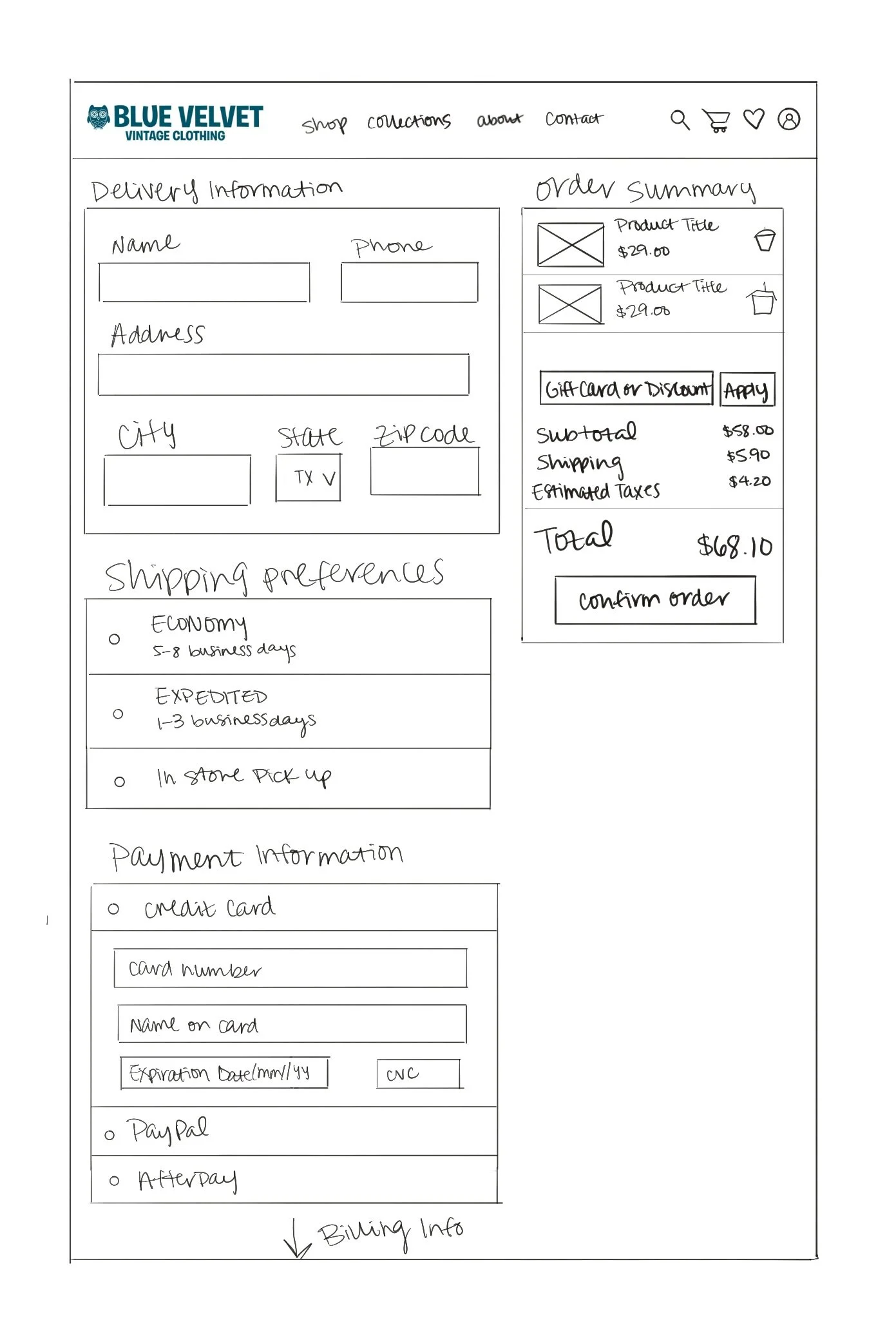 To visualize the proposed design concepts for the Blue Velvet e-Commerce redesign, I created a series of sketches, which offer a preliminary glimpse into the layout, navigation, and visual elements that aim to enhance the user experience. These sketches serve as a foundation for further iteration and refinement, while feedback from testing ensures seamless usability and alignment with the project objectives.